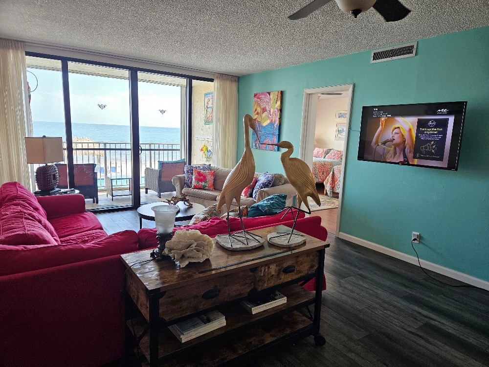 Our living room, designed for relaxation and bonding, opens to a private balcony with mesmerizing ocean views. Outdoors, the large heated pool invites you to unwind, or you can explore the sandy beach at your doorstep.